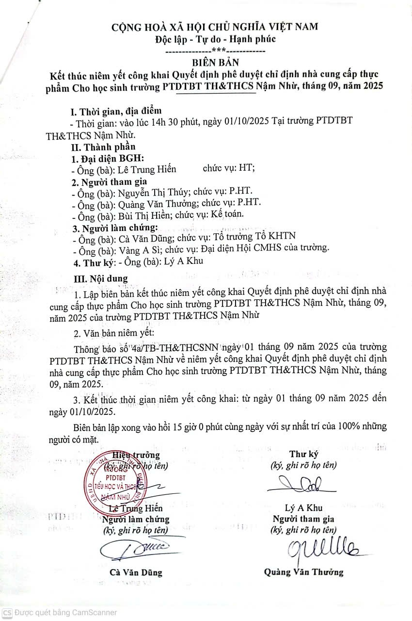 BIÊN BẢN Kết thúc niêm yết công khai Quyết định phê duyệt chỉ định nhà cung cấp thực phẩm Cho học sinh trường PTDTBT TH&THCS Nậm Nhừ, tháng 09, năm 2025