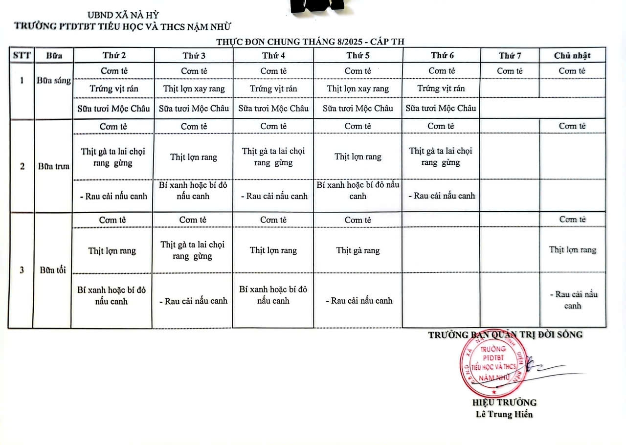 THỰC ĐƠN ĂN BÁN TRÚ THÁNG 8 - 2025