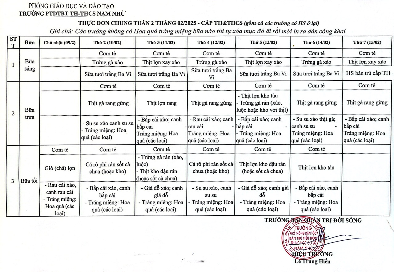 THỰC ĐƠN ĂN BÁN TRÚ THÁNG 2 - 2025
