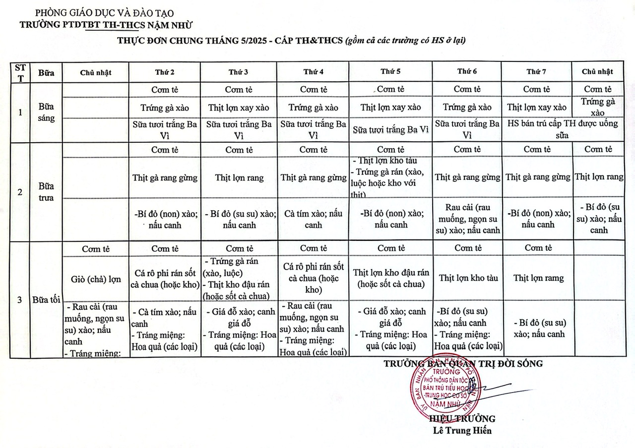 THỰC ĐƠN ĂN BÁN TRÚ THÁNG 5 - 2025